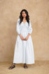 Designed for a flattering fit, this midi dress features three-quarter length voluminous sleeves with elasticated cuffs, a deep V-neckline with a delicate button and loop closure, and discreet inseam pockets at the hip for added functionality.